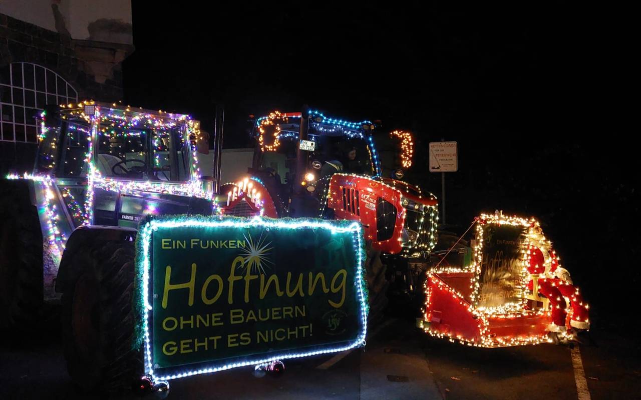 Mit ihren insgesamt 50 beleuchteten und geschmückten Traktoren haben sie an mehreren Stopps in Hagen und Ennepetal Halt gemacht und Schokonikoläuse verteilt. Unter anderem waren sie an der Klinik Ambrock zu Gast. Die Aktion entstand vor 3 Jahren, als viele Krankenhäuser und Heime wegen Corona für Besucherinnen und Besucher geschlossen waren. Um den Bewohnerinnen und Bewohnern eine Freude zu machen, schmückten die Landwirte ihre Fahrzeuge und fuhren zu ihnen, um etwas Weihnachtsstimmung zu verteilen.