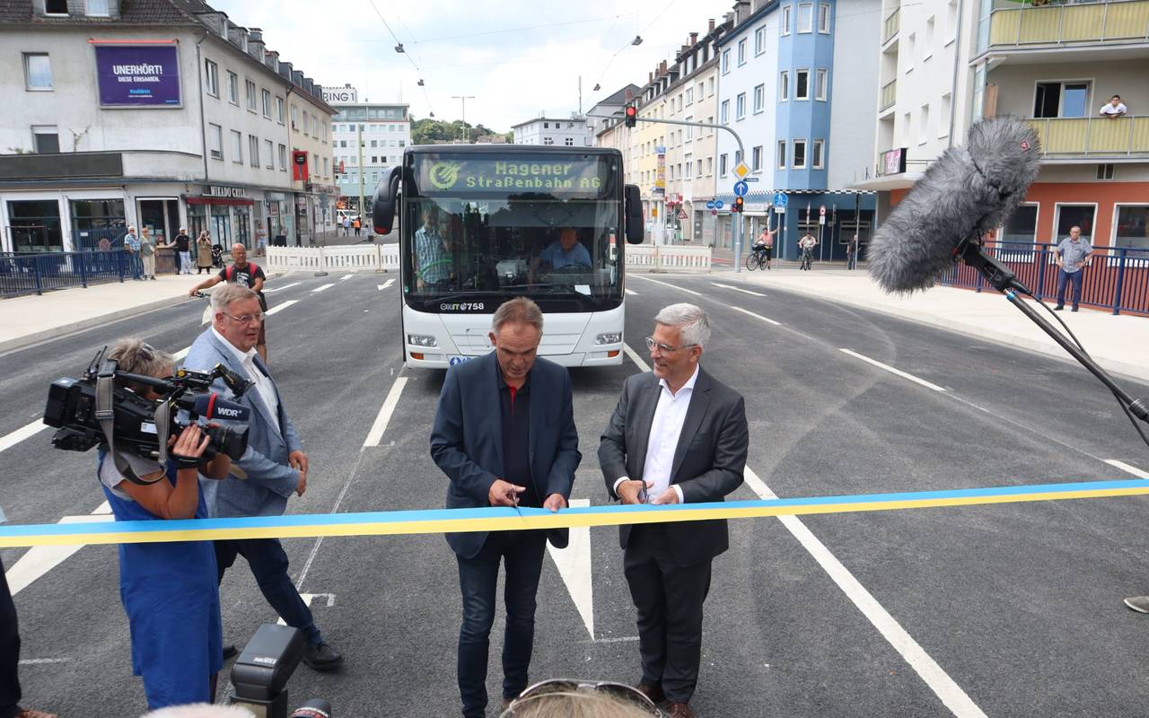Bei der Hochwasserkarastrophe vor einem Jahr war auch das neue Bauwerk überflutet und unterspült worden. Danach musste viel repariert und zum Teil ganz erneuert werden. Gleichzeitig waren die Baufirmen auch an vielen anderen Stellen in der Stadt im Einsatz gegen die Flut und die Folgen. Lockdown und Krieg behindern die Lieferketten. Es musste zum Teil lange auf bestimmtes Material gewartet werden. Zuletzt mangelt es am Stahl für die Brückengeländer. Nun ist die Brücke aber fertig, seit 12:00 Uhr rollt der Verkehr dort wieder.