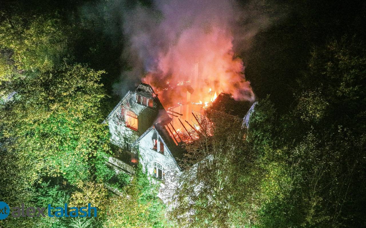 Eine historische Villa in der Schleipenbergstraße steht in Flammen. Das Haus ist seit Jahren unbewohnt und gilt als beliebtes Ziel sogenannter "Lost Placer". Die abgelegene Lage mitten im Wald ist eine Herausforderung für die Feuerwehr. Weil Einsturzgefahr besteht, kann auch nur von außen gelöscht werden.
