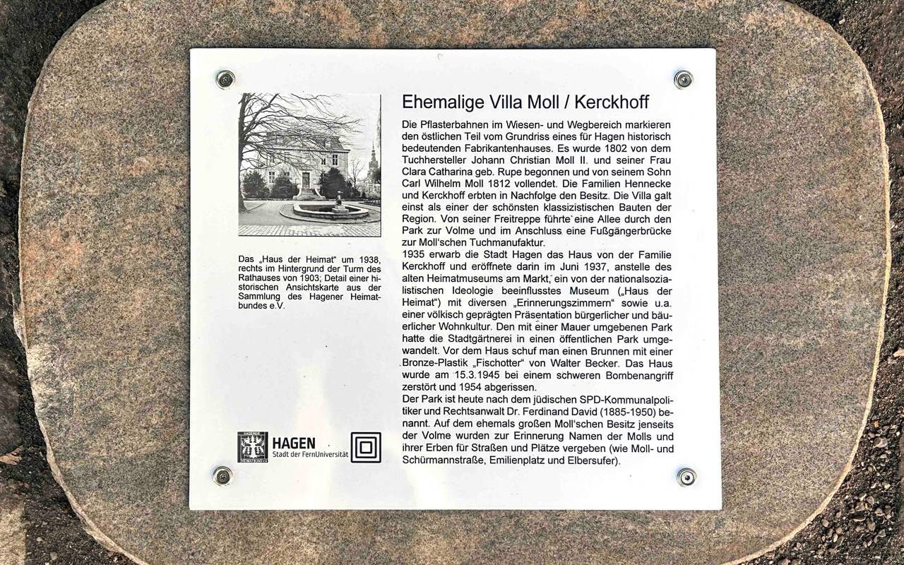 Unter anderem geht es um Erläuterungen zur Kerckhoffschen Grabanlage und den früheren Standort der Villa Moll, Wohnsitz einer ehemals bedeutenden Hagener Industriellenfamilie. Im Jahr 2022 hatten Unbekannte die alten Schilder, die auf kleinen Ständern angebracht waren, umgetreten. Die neuen Schilder befinden sich nun auf soliden, einbetonierten Steinen und dürften so wohl nicht mehr zerstört werden können. Wer mehr über die Kunstwerke und Denkmäler im Park erfahren möchte, kann im Rahmen des Urlaubskorbes am 31. Juli zwischen 15 und 17 Uhr an einer kleinen, kostenlosen Tour mit Stadtheimatpfleger Michael Eckhoff teilnehmen - anmelden kann man sich bei der VHS.