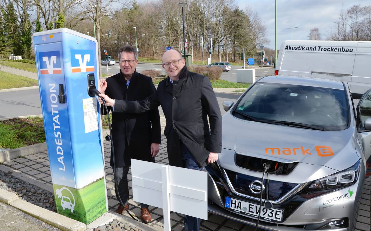 E-Mobile können nun auch an der Feithstraße aufgeladen werden, die Station hat zwei Ladepunkte. Die Mark E und die Märkische Bank treten dabei als Partner auf, die Bank kann sich vorstellen, auch an anderen Filialen Ladesäulen einzurichten.