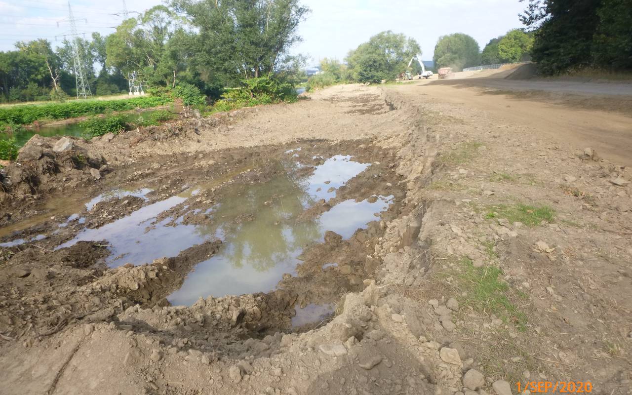 Die Bauarbeiten zur Renaturierung der Lenne gehen voran. Im Moment arbeitet der WBH auf der Uferseite an der Verbandsstraße daran, großflächig Bodenmaterial abzutragen. Teilweise ist er auch dabei, Lennebett und Lenneufer zu profilieren.