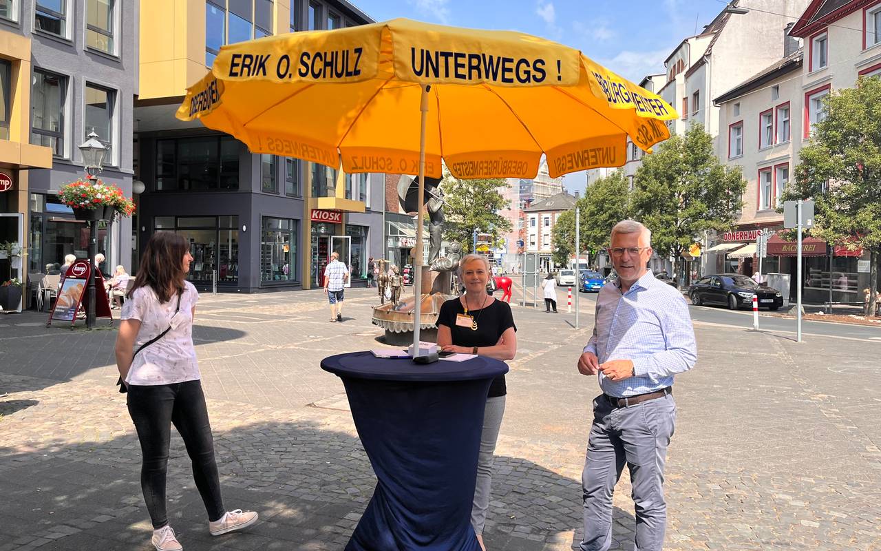 Von 11 bis 13 Uhr können Hagenerinnen und Hagener persönlich unter dem blau-gelben Sonnenschirm mit dem OB ins Gespräch kommen. Im Rahmen seiner Sommer tour hat Schulz schon zahlreiche konstruktive Gespräche geführt - über Themen, wie den Straßenverkehr, die wohnortnahe Versorgung mit Lebensmitteln, Arztpraxen und Apotheken, Freizeitgestaltung, aber auch ganz persönliche Belange.