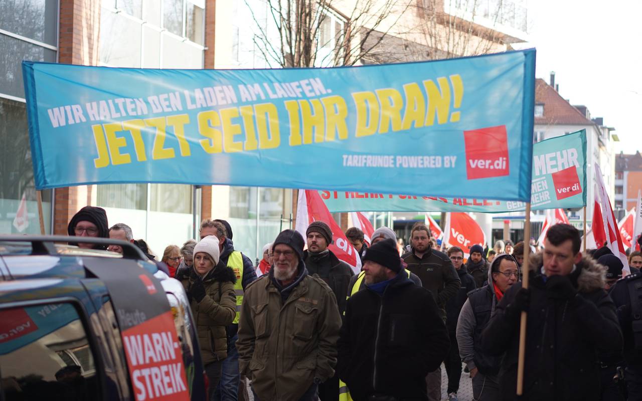 Gefordert wurden über 10% mehr Lohn. Erste Verhandlungen mit den Arbeitgebern sind gescheitert. Deshalb hatten die Gewerkschaften ver.di und Komba heute morgen zum Warnstreik aufgerufen. Mit dabei waren Arbeitnehmer der Stadtverwaltung und des Wirtschafts- und Entsorgungsbetriebs.