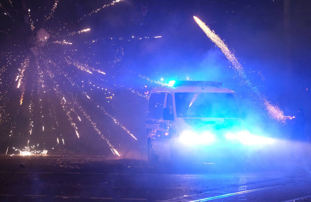 Ein Polizeifahrzeug wird im Stadtteil Connewitz mit Pyrotechnik beworfen. In der Neujahrsnacht kam es dort zu Ausschreitungen.