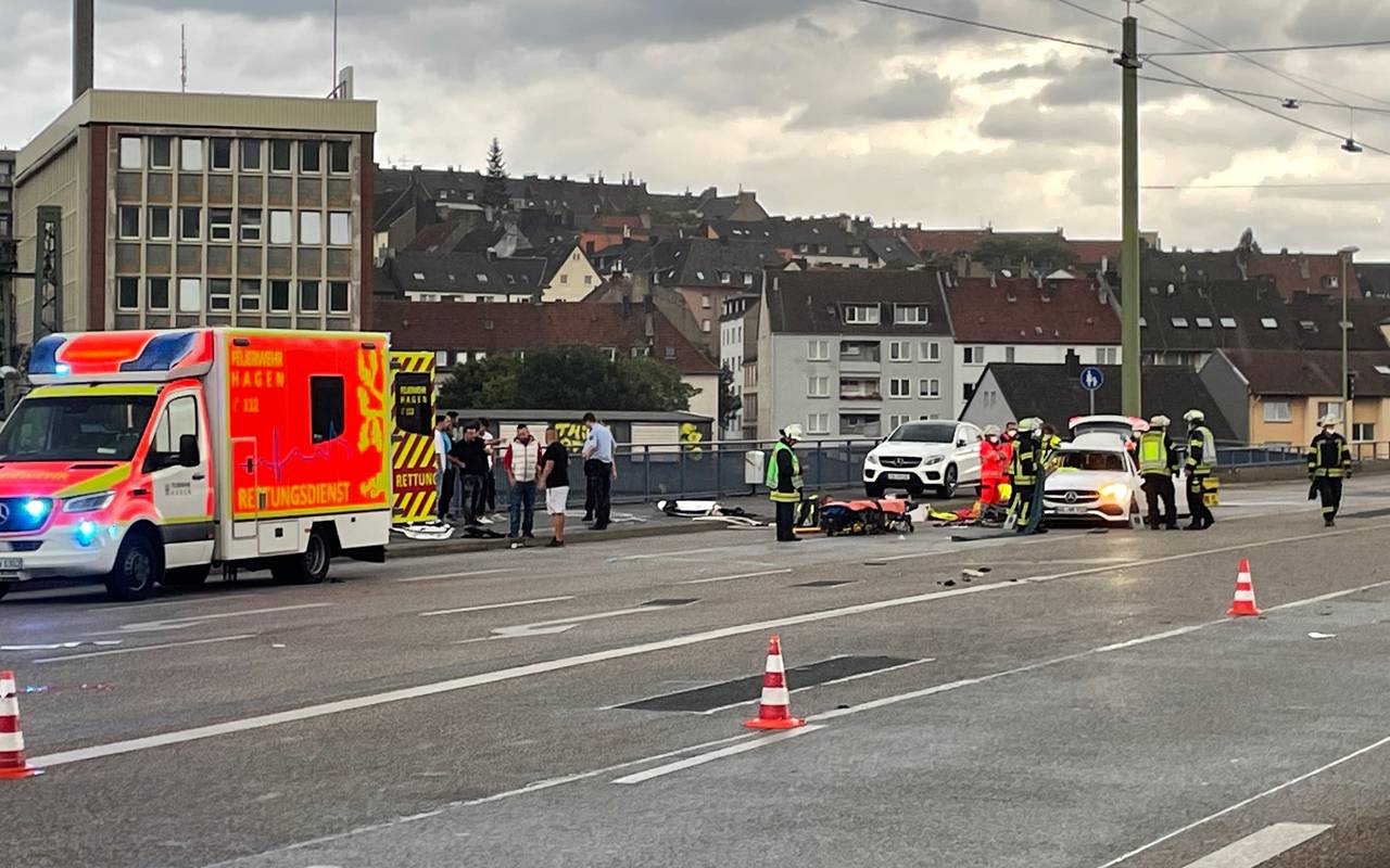 Auf der Altenhagener Brücke hat es am Abend einen schweren Unfall gegeben. Ein Fahrzeug mit drei Insassen ist ohne Beteiligung eines anderen Autos gegen einen der Schildpfeiler geprallt - es gibt drei Verletzte.