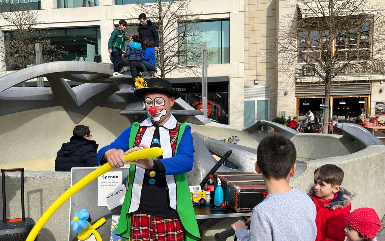 Auf dem Friedrich-Ebert-Platz ist gestern ein Clown für den guten Zweck aufgetreten. Dabei wurden Spenden für die Geflüchteten aus der Ukraine gesammelt.