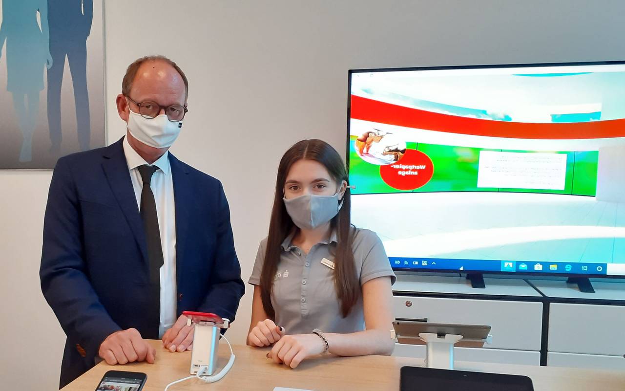 Die Sparkasse geht heute mit einem neuen Angebot an den Start. Im Sparkassenkarree gibt es den neuen Treffpunkt "Sparkasse-Digital". Ein ehemaliges Ladenlokal neben der Kundenhalle wurde die letzten Monate umgebaut. Kunden können sich hier ganz persönlich über Digitalisierung und Online-Banking beraten lassen.