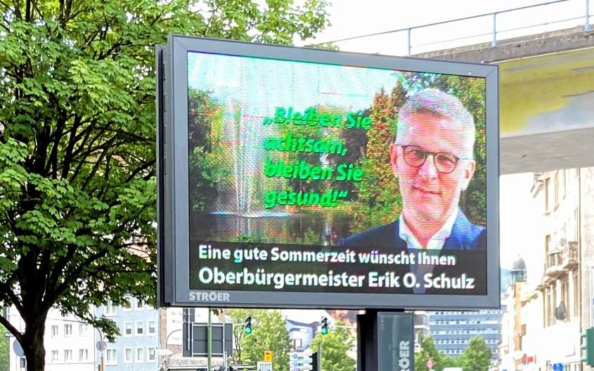 Auf Plakaten der Firma Ströer wünscht Oberbürgermeister Erik Schulz den Hagenern "eine gute Sommerzeit und Gesundheit". Die Firma Ströer macht für Hagen Stadtwerbung. Die SPD sagt, es handele sich bei den Plakaten nicht um eine wichtige Bürgerinformation, sondern um eine Sympathiewerbung für die Person. Oberbürgermeister Schulz stellte nun in einer Stellungnahme klar, dass die Aktion nicht mit der Kommunahlwahl im September im Zusammenhang stehe. Hierbei handle es sich um eine Maßnahme in Zeiten der Corona-Pandemie. Sie solle der Tendenz entgegenwirken, die Gefahr einer Infektion zu unterschätzen, so Schulz. Der geforderte Stopp der SPD erübrige sich, da die Aktion nur bis zum 24. Juli lief.