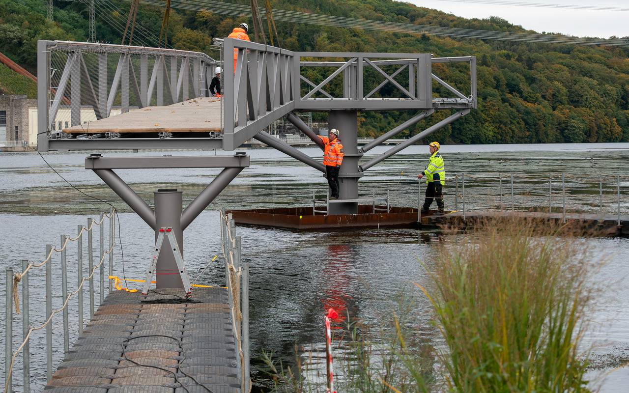 Die Sache läuft wie geschmiert. Zwei Kran-LKW stehen dabei. Mit ihrer Tragkraft von einmal und 120 und einmal 90 Tonnen haben sie genug Power, um die einzelnen Brückenelemente an ihre vorgesehenen Plätze zu hieven. Die Monteure strahlen die ruhige Gelassenheit von Männern aus, die wissen, was sie können und was sie tun. Die Planer wie etwa Patrick Messerschmidt von der Hagener Verkehrs- und Versorgungsgesellschaft sehen sich das Ballett mit tonnenschweren Teilen an: Teil eins schwebte schon nach ein paar Minuten präziser Kranführung auf seine Träger. Für Patrick Messerschmitt als Projektleiter ist das sozusagen der Schlusspunkt jahrelanger Arbeit. "Seit 2017 bin ich an dem Projekt dran: Beachclub, Umbau Strandhaus, Promenade - und der Steg. Ich bin froh, dass es jetzt so weit ist."