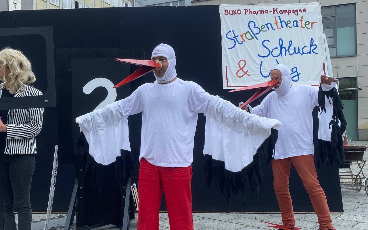 Die Schauspieler des Theaters machen auch noch nach dem Stück auf die Buko-Pharmakampagne aufmerksam, in dessen Namen Sie auftreten. Diese leistet seit 40 Jahren kritische Auseinandersetzung mit der Pharmaindustrie. Falls ihr mehr darüber erfahren wollt, gelangt ihr über diesen Link auf die Buko Homepage.