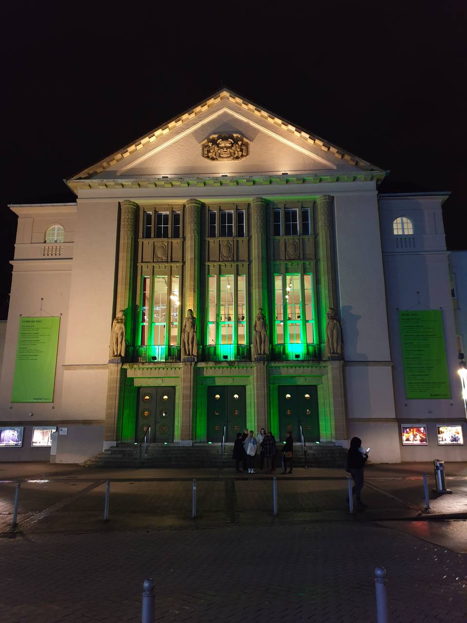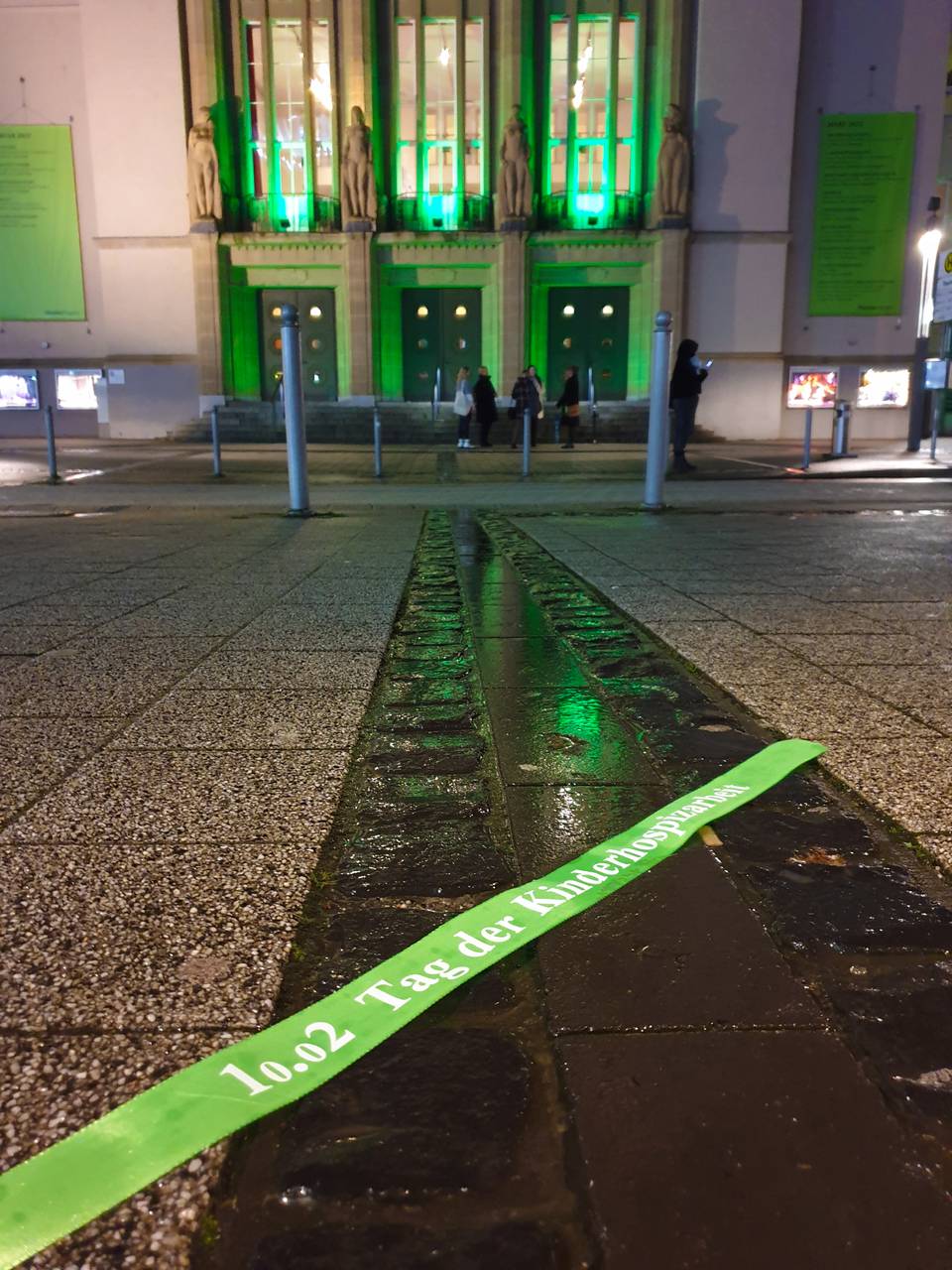 Zu diesem Anlass wurde das Theater den ganzen Abend lang grün angeleuchtet. Für die Aktion steht nicht nur die Farbe Grün als Zeichen der Hoffnung, sondern auch grüne Bänder als Zeichen der Verbundenheit. Der Tag der Kinderhospizarbeit findet seit 2016 statt und soll auf die Situation der lebensverkürzend erkrankten Kinder und deren Familien aufmerksam machen. Vor allem aber dient der Tag als Zeichen für die Arbeit in den Kinderhospizen. Als Dank gab es vom Theater auch noch ein kleines Geschenk, bestehend aus Freikarten.