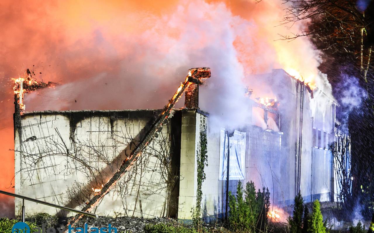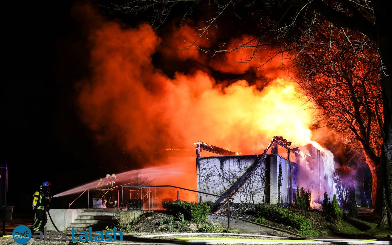 Meterhohe Flammen schlagen in den Nachthimmel: Das Vereinsheim des Hagener Tennisclubs Blau-Gold (400 Mitglieder) ist in der Nacht zu Samstag (02.03.2024) abgebrannt.