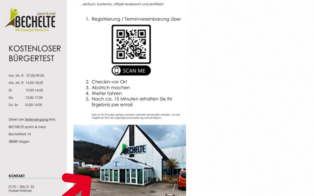 In der Bechelte gibt es jetzt Schnelltests. Auf dem Gelände des „Bechelte Sports & Med“ kann man sich heute bis 16 Uhr und ab morgen wie auf dem Foto angegeben angegeben testen lassen. Einen Termin kann man über den QR-Code oder unter www.schnelltest-Bechelte.de vereinbaren.