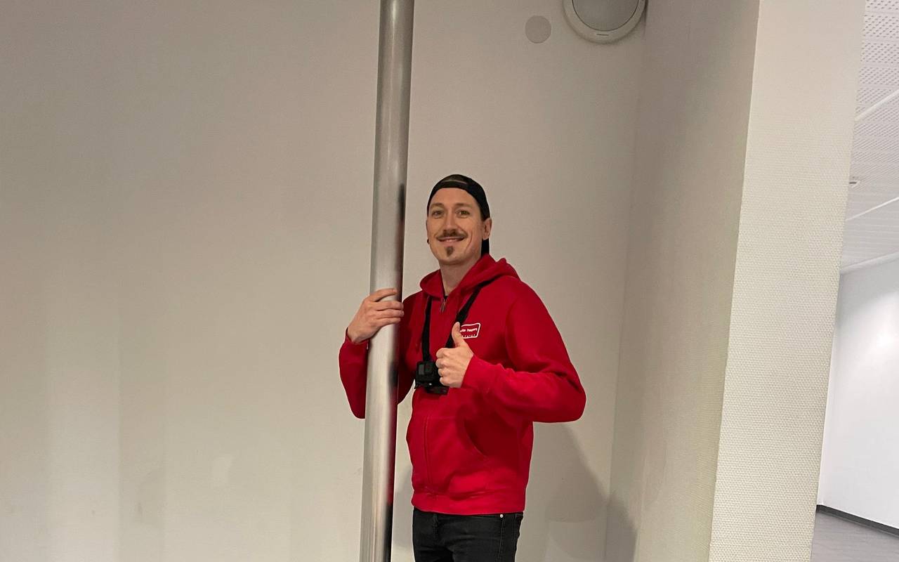 Das Setting: Timo, Feuerwehrsprecher Peter Thiele und die Feuerwehrstange in Hohenlimburg...