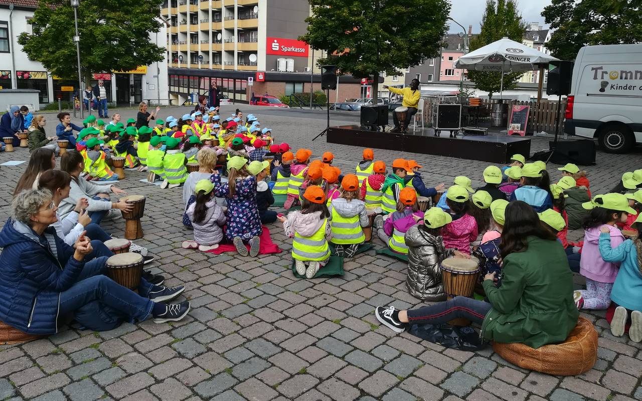 Gestern gab es auf dem Friedensplatz in Altenhagen ungewohnte Laute: Dutzende Kinder aus Hagener Kitas haben dort einen Trommel-Workshop besucht.