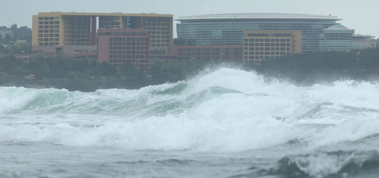 Hohe Wellen treffen die Küste der Jeju-Insel, während sich der Taifun Jongdari nähert.