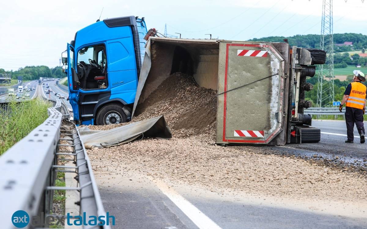 Fahrer und Beifahrer blieben unverletzt. Andere Verkehrsteilnehmer kamen ebenfalls nicht zu Schaden. Der Lkw verlor nach Angaben der Feuerwehr 200 Liter Diesel und 150 Liter Öl - Feuerwehrleute mussten die auslaufende Betriebsmittel abstreuen. Fahrbahn und Leitplanke wurden bei dem Unfall beschädigt. Wegen der Bergungsarbeiten kommt es zu Verkehrsbehinderungen - der Verkehr wird über den Standstreifen vorbeigeleitet.