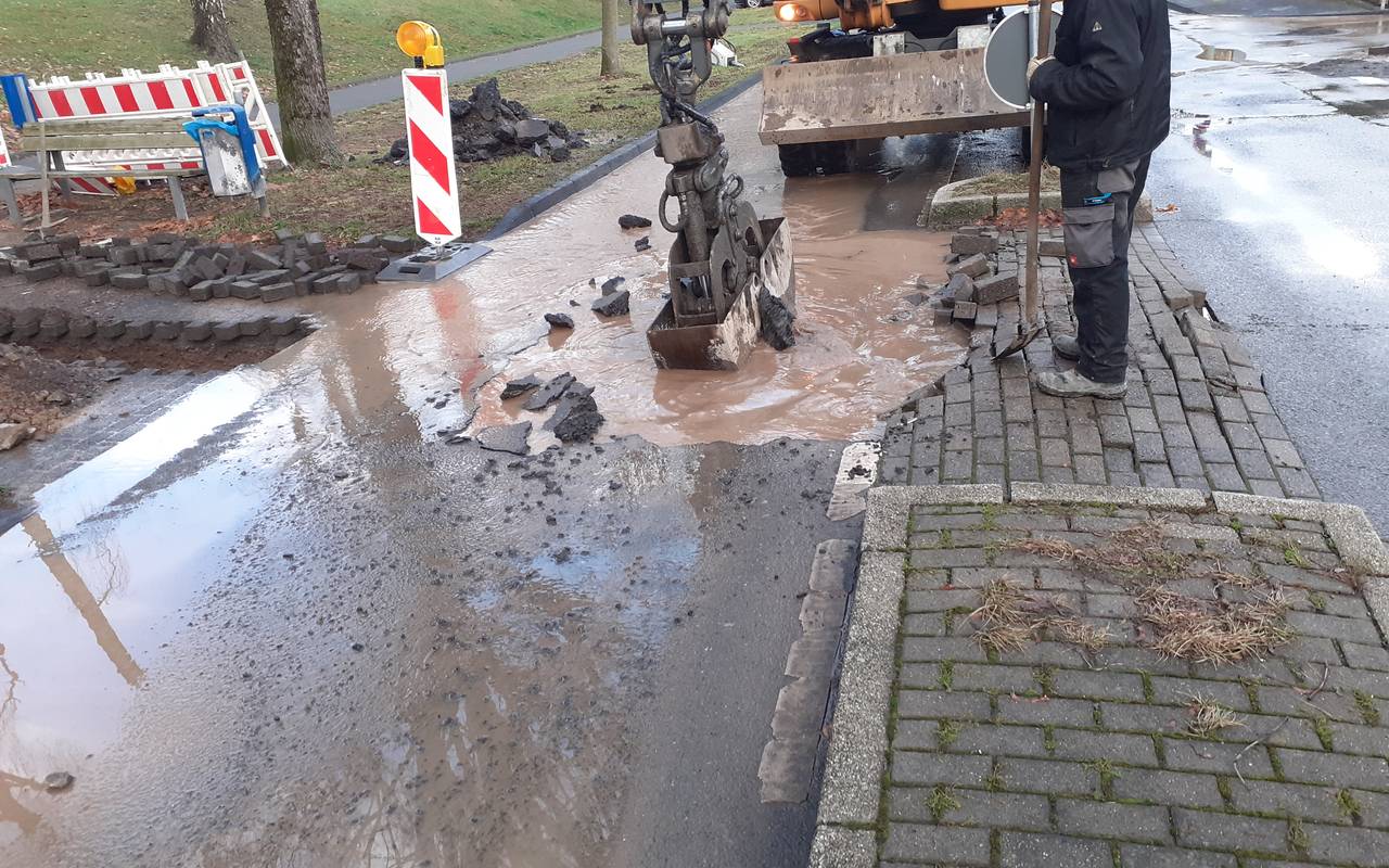 Bei Tiefbauarbeiten zum Glasfaserausbau Auf dem Birkenhain ist eine Hauptwasserleitung beschädigt worden. Das führt zu teilweise unterschiedlichen Ausfällen; es kann einen vorübergehenden Druckabfall gegeben haben, es kann auch das Wasser ganz weg sein.