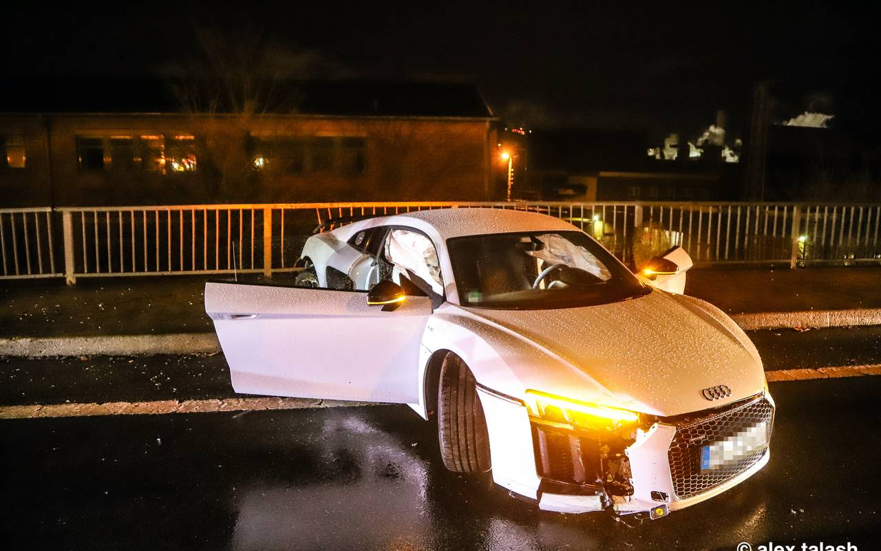 Mit seinem Audi R8 V10 fuhr der Fahrer über den Bordstein und prallte gegen das Brückengeländer. Durch den Aufprall wurde der Sportwagen zurück auf die Fahrbahn geschleudert. Der Fahrer blieb bei dem Unfall unverletzt. Das hochmotorisierte Auto war nach dem Unfall nicht mehr fahrbereit und musste abgeschleppt werden. Den Schaden schätzt die Polizei auf mehrere zehntausend Euro.
