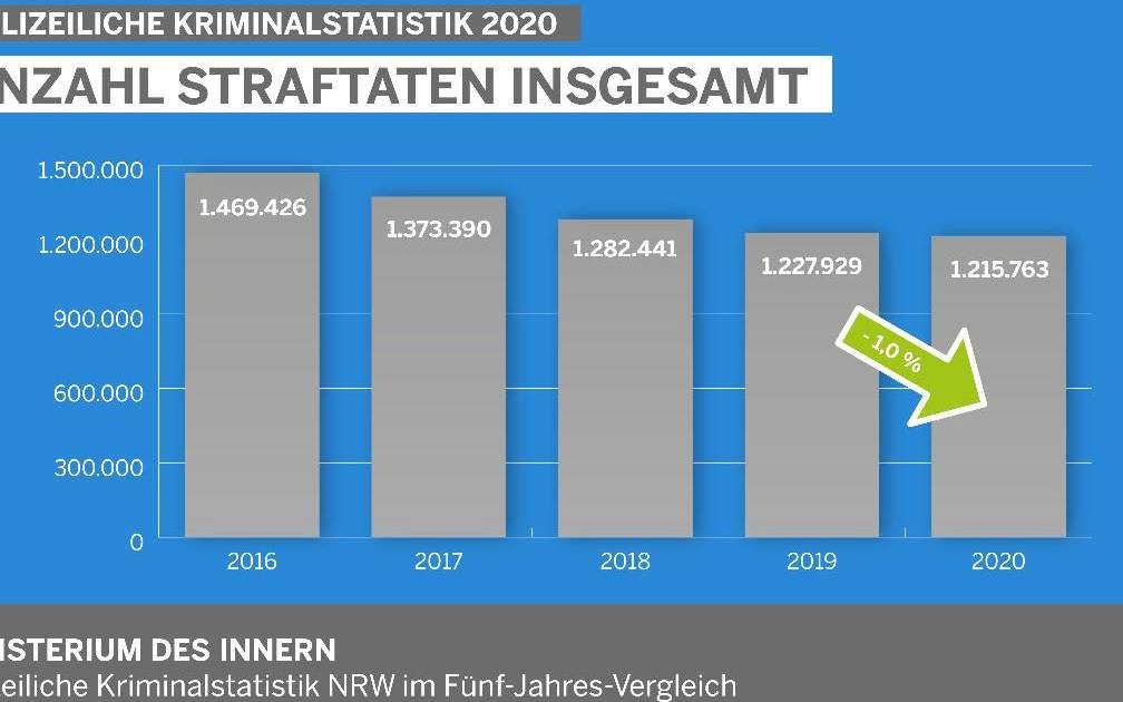 NRW-Innenminister Reul hat allen Grund sich zu freuen: In Nordrhein-Westfalen ist die Kriminalität im vergangenen Jahr zurückgegangen. Die Gesamtzahl aller registrierten Straftaten in der Statistik der Polizei ging im vergangenen Jahr um ein Prozent zurück. Es gab insgesamt 1.216.000 Straftaten.