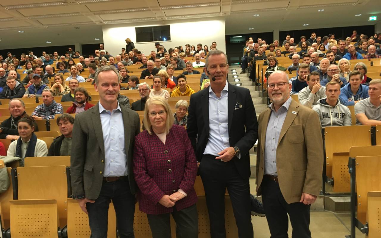 Der ehemalige Boxweltmeister Henry Maske (auf dem Bild 3. von links) war heute zu Gast in der Fachhochschule Südwestfalen. Dort hiel er im Rahmen der 30. Hagener Hochschulgespräche einen Vortrag über seine Karriere und sein heutiges Leben. In den Jahren 1993 bis 1996 verteidigte Henry Maske den Titel als Boxweltmeister im Halbschwergewicht. Er verlor als Profiboxer nur einen einzigen Kampf - seinen letzten - und erzählte den rund 500 Zuschauern unter anderem von seinen Gedanken in diesem Moment. Der Vortrag ging etwa eineinhalb Stunden. Im Anschluss verteilte Maske Autogramme. Unsere Radio Hagen Reporterin Anja Ferber war dabei.