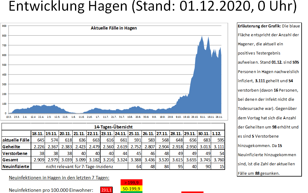 Drei weitere Menschen sind bei uns mit dem Coronavirus gestorben – da war die Viruserkrankung aber nicht die Todesursache. Aktuell haben wir in der Stadt 595 Hagener, die mit dem Virus infiziert sind. Die Zahl der Infizierten ist im Vergleich zu gestern um 88 gesunken. Aktuelle Informationen und Daten gibt es auf der Webseite der Stadt Hagen unter www.hagen.de/corona