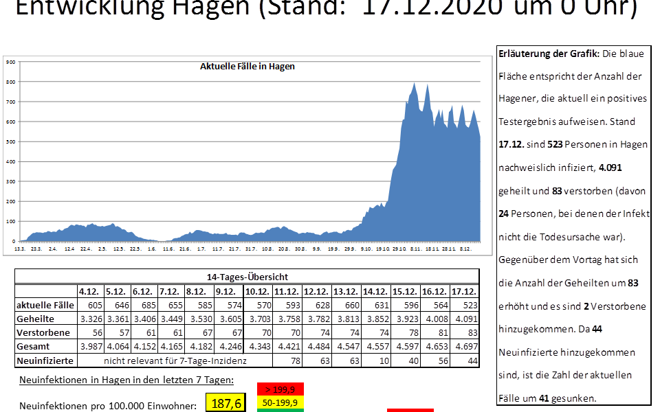 Wir haben im Moment 543 nachgewiesene Infektionen in der Stadt, noch einmal weniger als gestern. Der Inzidenzwert liegt aktuell bei 188 und ist damit nicht mehr im roten Bereich. Allerdings ist das nur eine Momentaufnehme. Das Infektionsgeschehen in Hagen zeigt für die letzten Wochen ein auf und ab, bei dem insgesamt eine sinkende Tendenz zu beobachten ist.